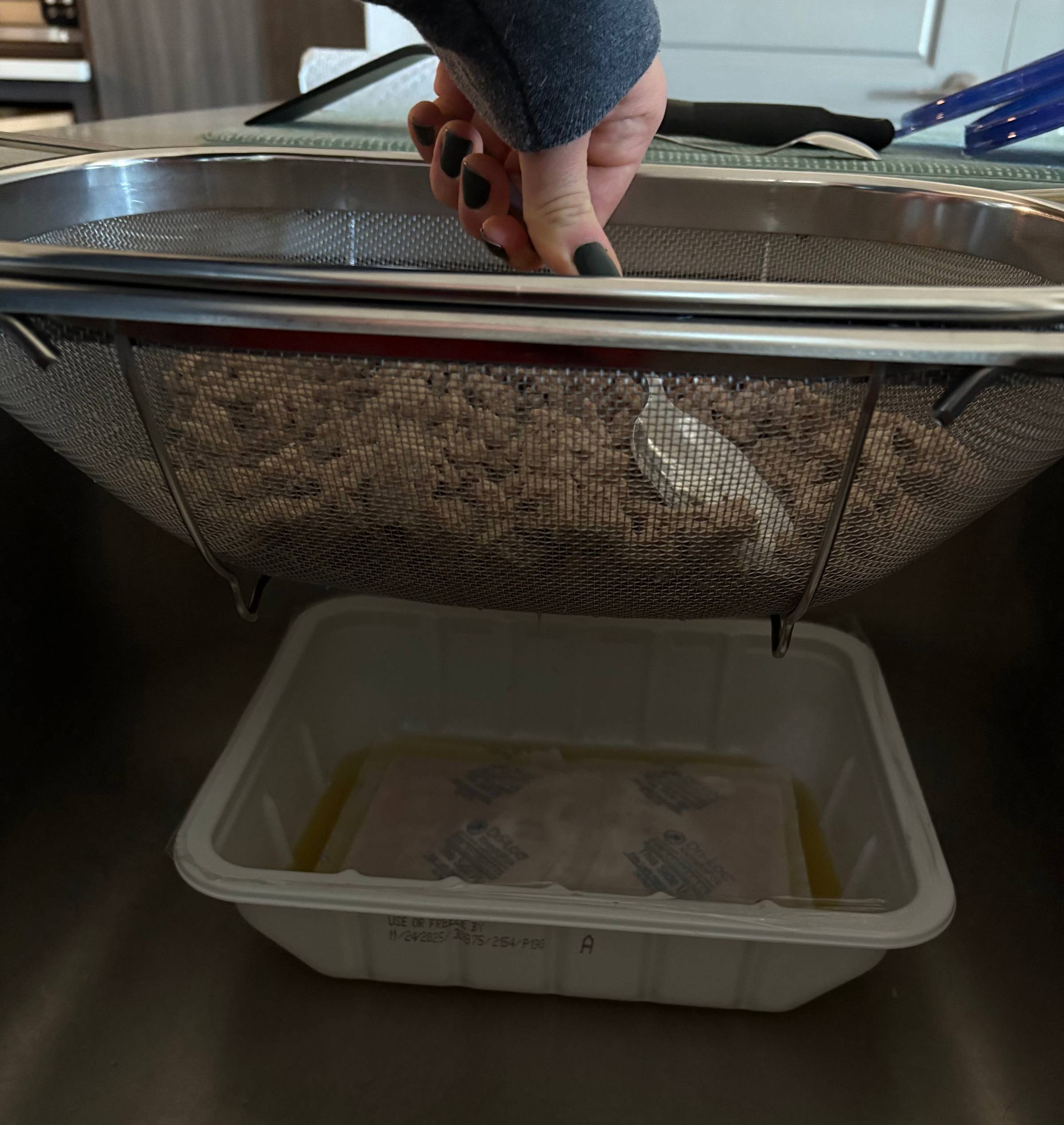 Once you've added in all your ingredients, stir it all together, continuing to ground the turkey, and then cover it and let it sit and cook down for about 5 minutes. This is usually when I'll start washing the strainer and disposing the fat.