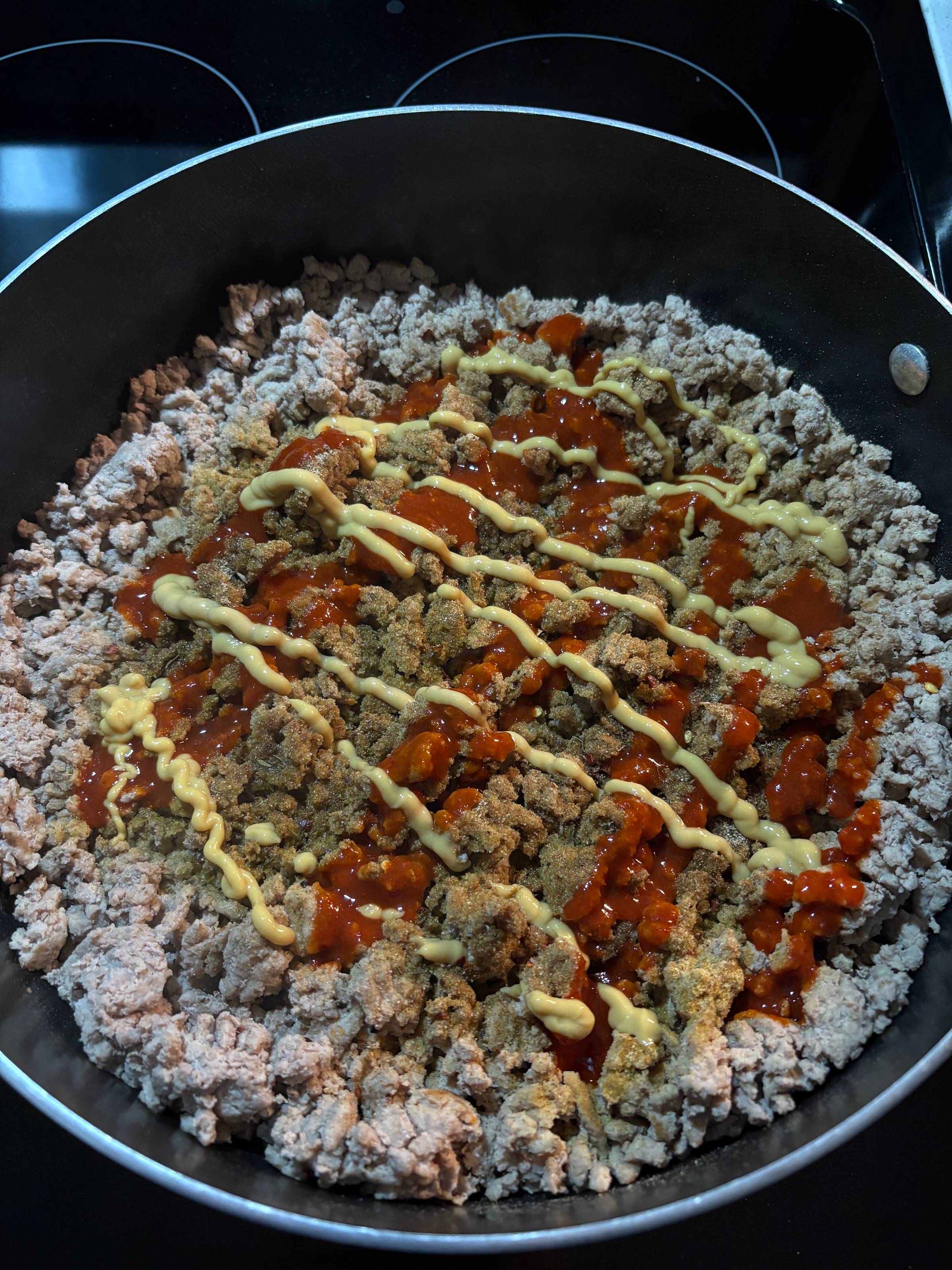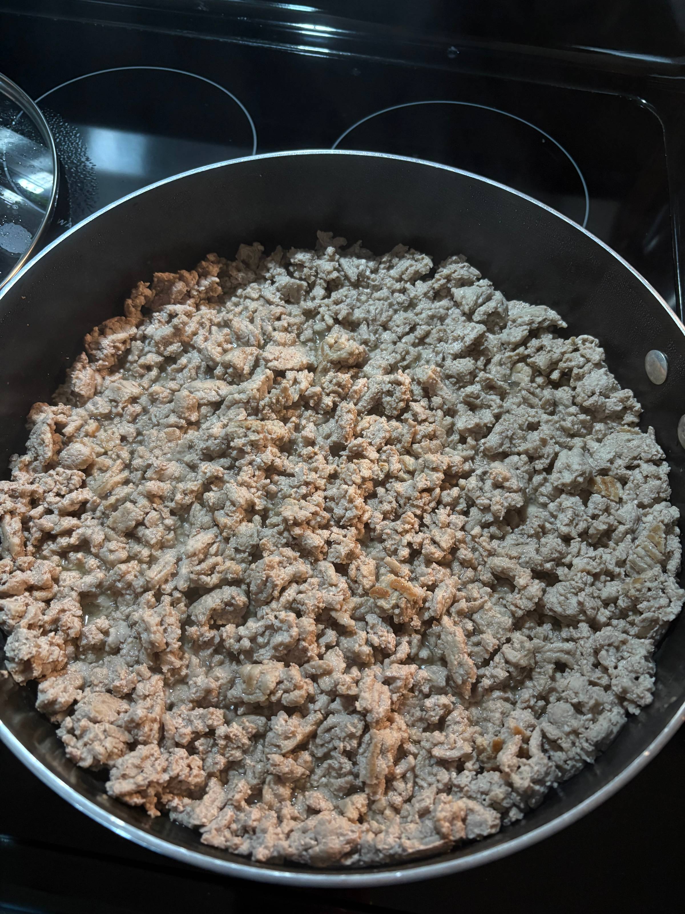 First, throw the ground turkey in a deep pan and cover until it browns. I usually keep it covered for 5 minutes, reground the turkey so it cooks evenly, and then cover for another 3 minutes or so, until you can't see any pink, or uncooked meat.